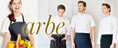 FOOD SERVICE WEAR arbe/飲食・サービス向けウェア 日本の『外食&サービス業』を元気にする仕事着。あらゆるサービスシーンを、機能とデザインでサポート。 エプロンコーナー 豊富なカラー展開、デザイン性、機能性と豊富なラインナップ。 アルベ スタンドカラーシャツ シェフメイト α-100 厨房靴 住商モンブラン スラックス アルベ エプロン(前掛け)