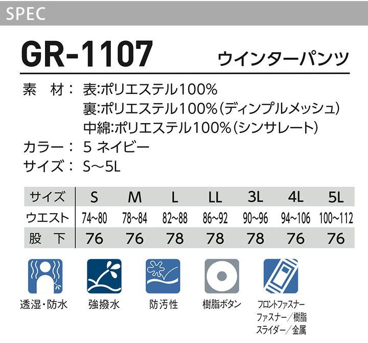 他の画像を見る 主要縫製部分に防水テープを使用した、本格透湿防水防寒シリーズ 防寒パンツ GR-1107 ウィンターパンツ 防汚 強撥水 透湿 防水 防寒着 防寒服 作業着 作業服 アウトドア タカヤ商事【5L】 本体価格 ¥ 15,730 税込 在庫切れ カートに入れる お気に入りに登録する