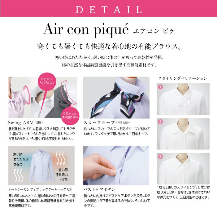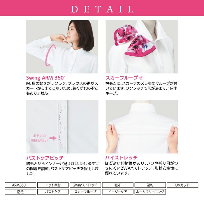 他の画像を見る どんなに動いても、乱れてこない!寒くても暑くても快適な着心地の有能ブラウス。吸汗 速乾 UVカット 防透 体温調整 ホームクリーニング カーシーカシマ【ENJOY】シャツブラウス(長袖)EWB-434 事務服 レディース 女性用 制服 ユニフォーム 本体価格 ¥ 5,830 税込 カートに入れる お気に入りに登録する