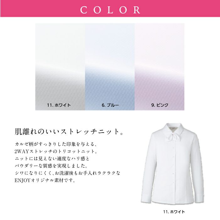 他の画像を見る 動きやすく、シワになりにくく、お手入れ簡単。ニット特有のダレ感を解消し、きちんときれい見え。通気性が良いのに透けにくい、万能ニットブラウスです。 ブラウス 長袖 カーシー ENJOY EWB872 事務服 オフィスウェア オールシーズン ストレッチ ニット 吸汗 速乾 形態安定 透け防止 UVカット 汚れが落ちやすい 高通気 ムレにくい リボン付き レディース 女性用 制服 オフィス ユニフォーム エンジョイ【送料無料】 本体価格 ¥ 4,650 税込 カートに入れる お気に入りに登録する