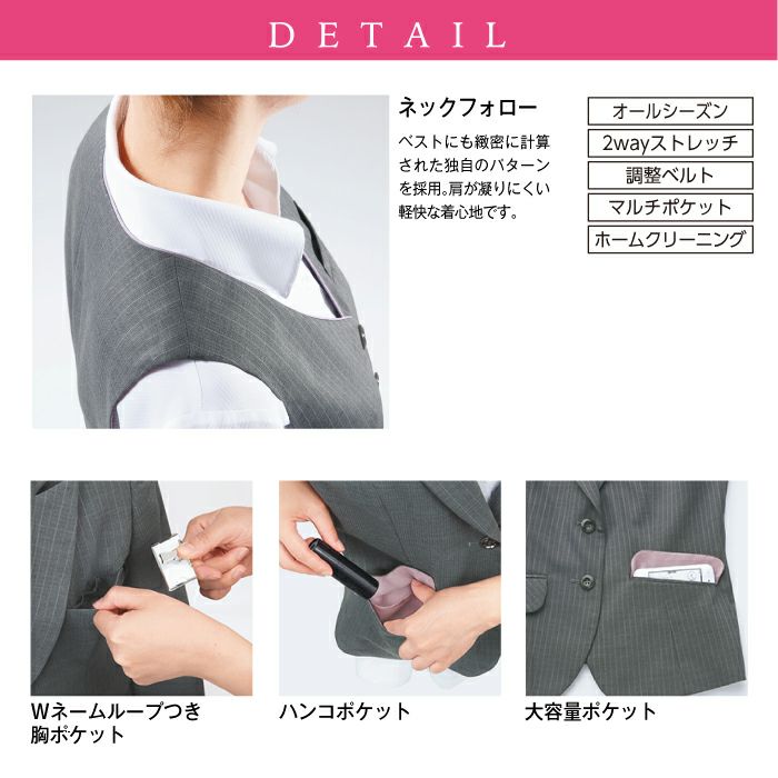 他の画像を見る 空気のような軽さソフトな肌触りウールの質感が魅力のストライプベスト。バツグンの動きやすさ2WAYストレッチ!ホームクリーニング カーシーカシマ ベスト EAV-380【ENJOY】事務服 レディース【19号】女性用 制服 ユニフォーム オールシーズン 調整ベルト ホームクリーニング 本体価格 ¥ 17,160 税込 在庫切れ カートに入れる お気に入りに登録する