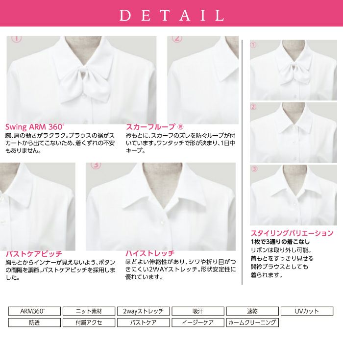 他の画像を見る 肌離れの良いストレッチニット。シワになりにくくお手入れも簡単!取り外し可能なリボンで3通りの着こなしが出来るブラウス。吸汗 速乾 防透 UVカット カーシーカシマ ブラウス(長袖) EWB-692【ENJOY】事務服 レディース 吸汗 速乾 UVカット 防透 ホームクリーニング 女性用 制服 ユニフォーム 本体価格 ¥ 5,148 税込 カートに入れる お気に入りに登録する