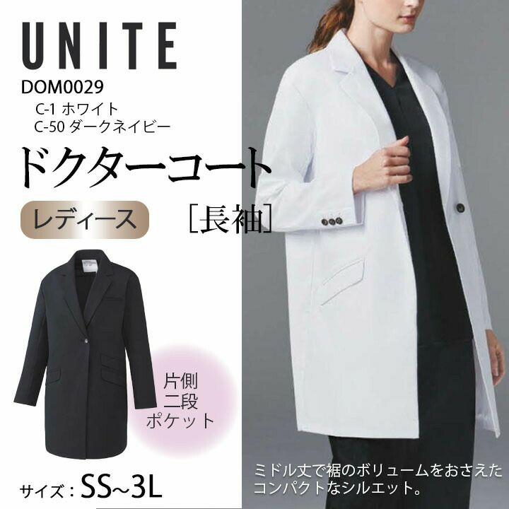 ドクターコート レディース DOM-0029 長袖 医療用 白衣 おしゃれ 看護 ナース 病院 介護 医者 美容 エステ 女性用 SEK 透け防止 制電 ストレッチ UVカット 制菌 DOM0029 チトセ ネイビーホワイト