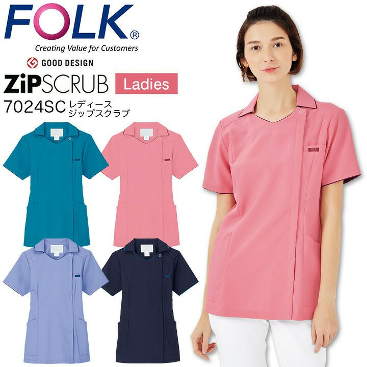 【メール便送料無料※代引不可】フォーク 襟付き ジップスクラブジップスクラブ 7024SC レディース 女性用 制電 吸汗 速乾 医療 看護師 ナース 医師 医者 病院 制服 FOLK【S-4L】