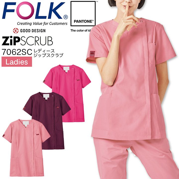 【メール便送料無料※代引不可】ジップスクラブ フォーク 7062SC レディース 女性用 Vネック 医療 看護師 介護士 ナース 医師 医者 病院 制服 FOLK【S-4L】