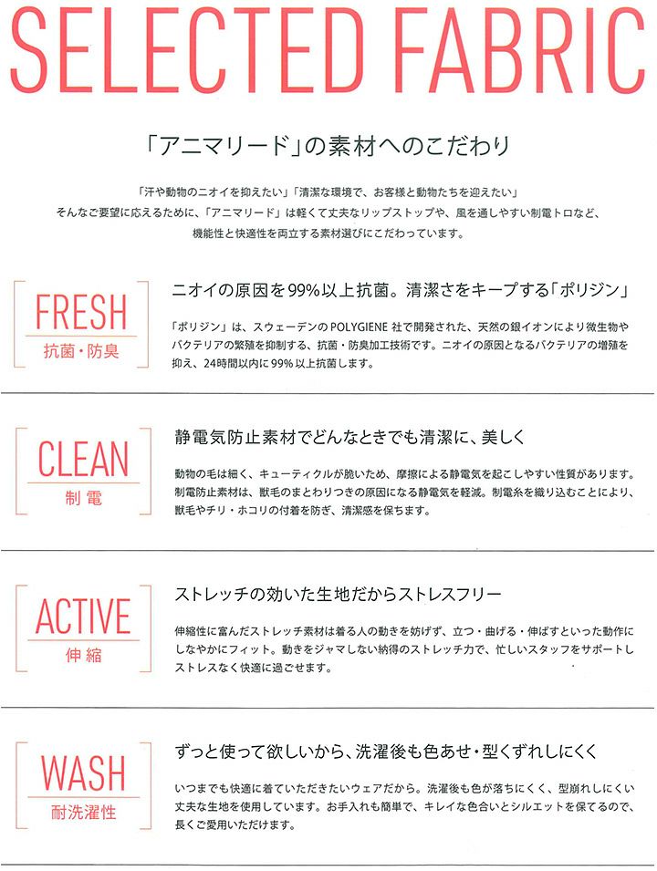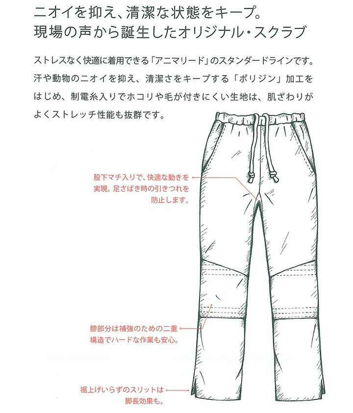 他の画像を見る ニオイを抑え、清潔な状態をキープ。現場の声から誕生したオリジナル・スクラブパンツ。 【メール便送料無料】スクラブパンツ アニマリード AL-0003 動物病院 獣医師 男女兼用 メンズ レディース ズボン 抗菌 防臭 ストレッチ 制電 看護師 医療白衣 制服 チトセ ANIMALEAD AL0003 本体価格 ¥ 5,450 税込 カートに入れる お気に入りに登録する