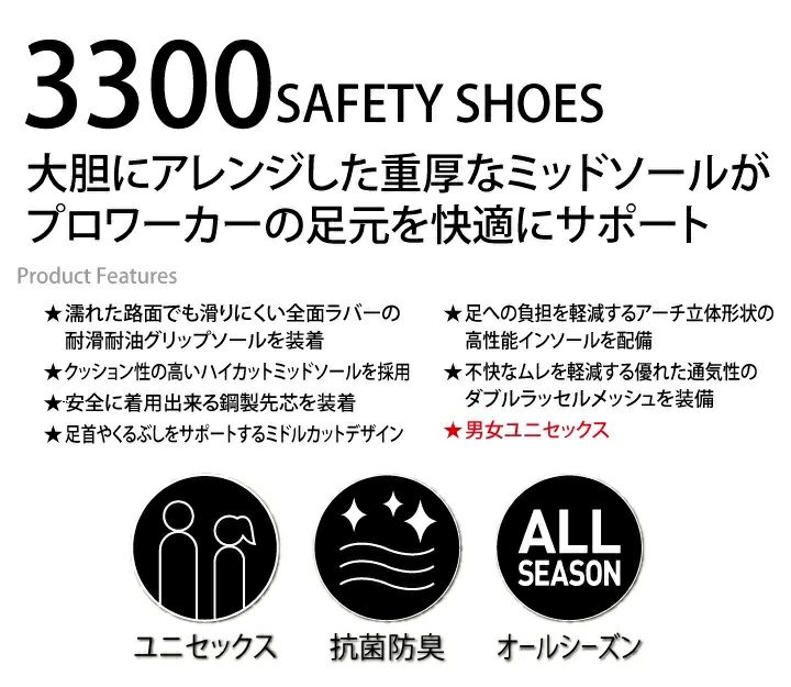 他の画像を見る 高通気仕様の超軽量ミドルカットシューズ。 Z-DRAGON 安全靴 セーフティシューズ S3213 ミドルカット 衝撃吸収 超軽量 紐タイプ 自重堂 作業靴 本体価格 ¥ 2,945 税込 カートに入れる お気に入りに登録する