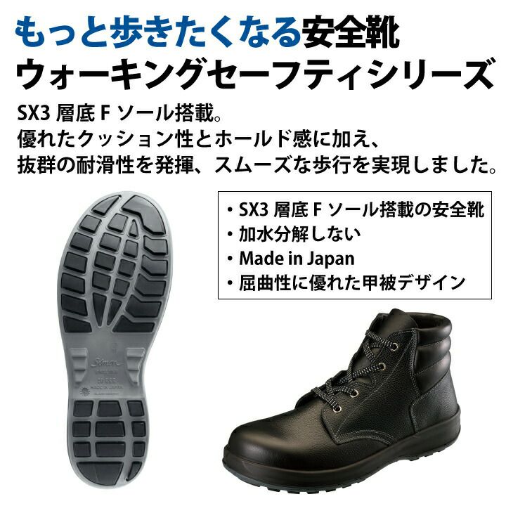 他の画像を見る もっと歩きたくなる安全靴 ウォーキングセーフティシリーズ シモン SF22 WS22黒 安全靴 安全中編上靴 セーフティシューズ ハイカット JIS T8101 SX3層底Fソール 耐滑性 柔軟性 クッション性 安定性 抗菌 防臭 足にフィット 耐油 耐薬品性 つまづき防止 トゥスプリング 本体価格 ¥ 10,725 税込 在庫切れ カートに入れる お気に入りに登録する