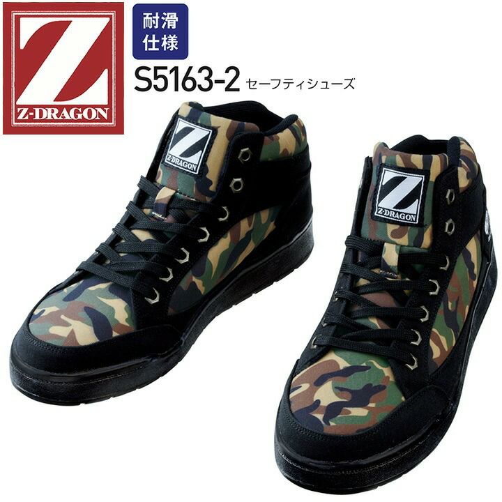Z-DRAGON 安全靴 セーフティシューズ S5163-2 ハイカット カモフラ 迷彩 耐滑 紐タイプ 自重堂 作業靴 かっこいい おしゃれ