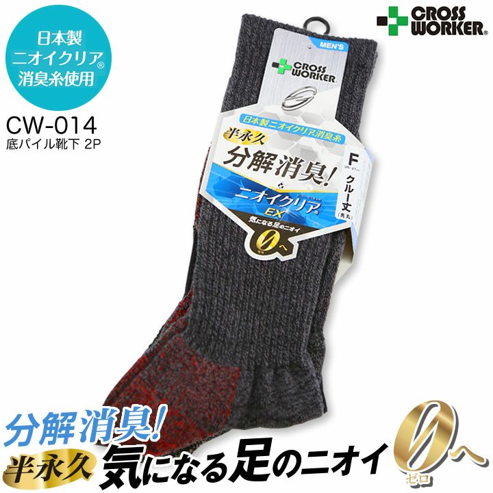 底パイル 消臭 靴下 先丸 2P CW-014 クルー丈 カラー ニオイクリア ズレ防止 作業用 作業服 作業着 足 くさい お悩み