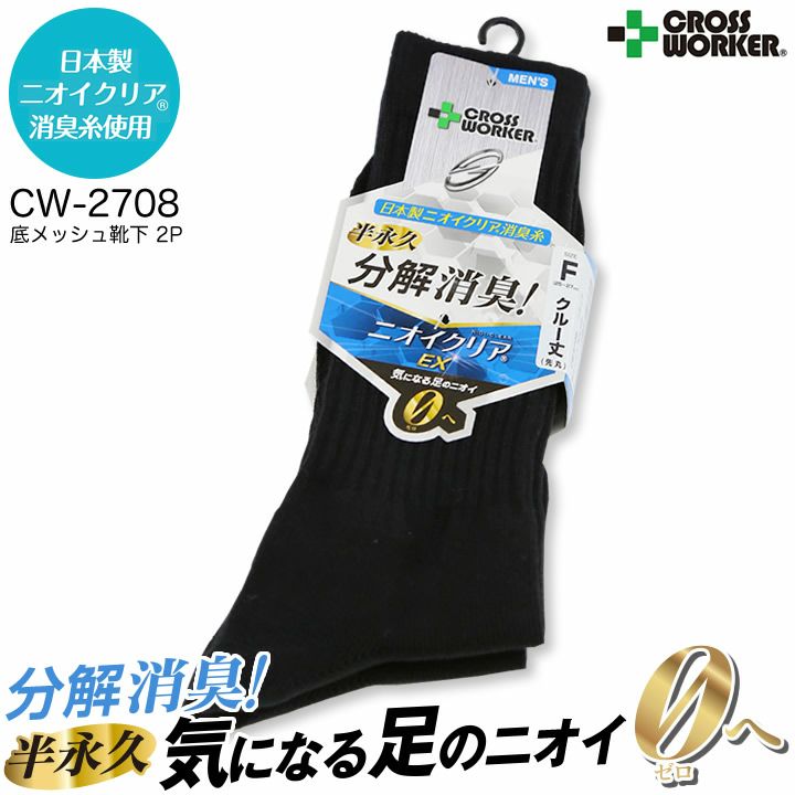 消臭 靴下 先丸 2P CW-2708 クルー丈 底メッシュ ニオイクリア 無地 黒 ズレ防止 作業用 作業服 作業着 ブラック 足 くさい お悩み