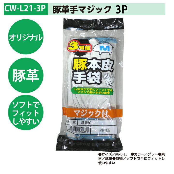 【当日発送】手袋 革手 皮手 豚革手マジック付き 3双 CW-L21-3P 柔らかい ソフト フィットしやすい オリジナル 作業用 作業着 作業服 当日出荷 即日発送 即日出荷 あす楽