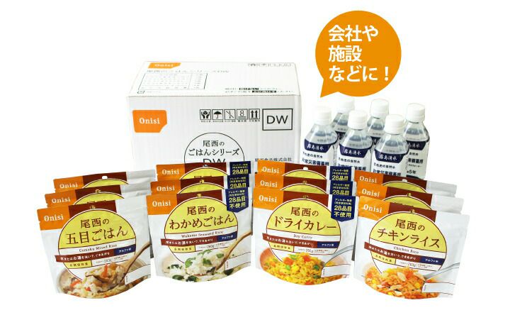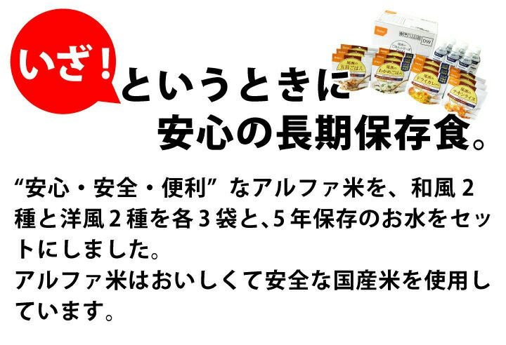尾西のごはんシリーズ(和風・洋風組合せメニュー+保存水6本) 尾西食品 メーカー製造から5年保存 非常食 ご飯 国産米 防災グッズ 防災用品 長期保存 災害用備蓄 会社 企業 オフィス 施設 学校 豪雨 豪雪 大雨 台風対策 地震 災害対策 キャンプ 登山 コロナ 自宅療養 食料