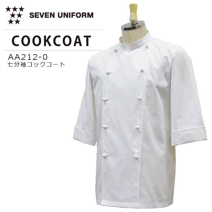セブンユニフォーム 七分袖コックコート AA212-0 男女兼用 軽量 涼しい 通気性 防透性 制電 厨房 キッチン 飲食業 レストラン 白衣 7分袖 SEVEN UNIFORM【SS-LL】