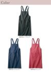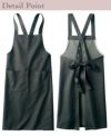 エプロンはベーシックな後ろクロスタイプで、肩ひも三段階調節可能。大きめポケットはマチ付き。どちらのエプロンも配色のステッチがカジュアル感を演出します。