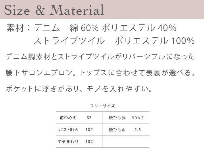 他の画像を見る デニム調素材とストライプツイルがリバーシブルになった腰下サロンエプロン。 サロンエプロン 腰巻き 住商モンブラン BW9503 ブランシェ メンズ レディース 男女兼用 デニム 飲食店 ユニフォーム 制服 カフェ サービス キッチン 接客業 レストラン 本体価格 ¥ 4,950 税込 カートに入れる お気に入りに登録する