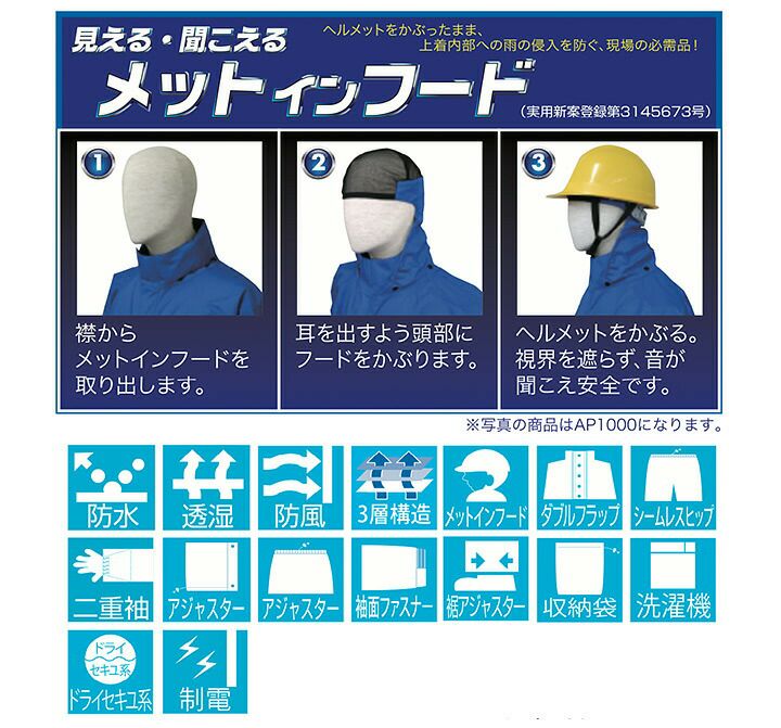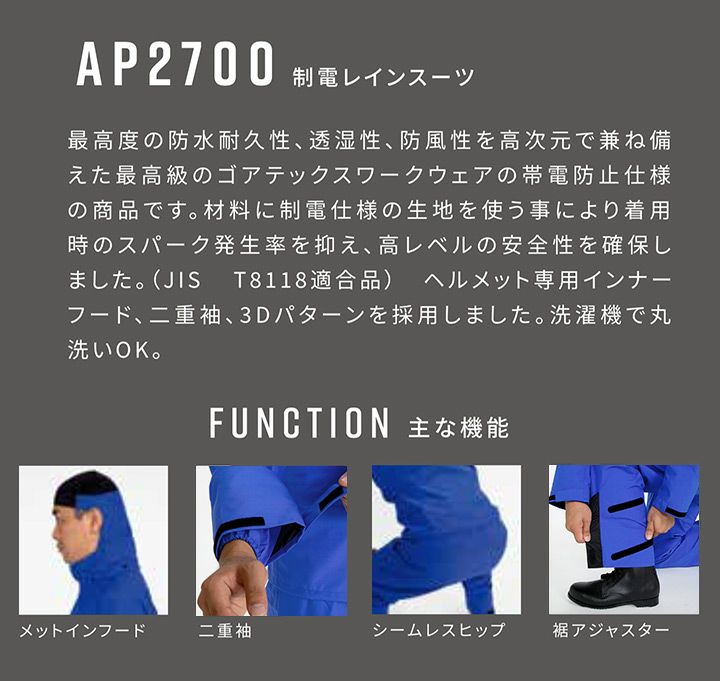 他の画像を見る ゴアテックス3層構造生地の採用により最高度の透湿性・防水性・防風性を実現。 制電レインスーツ 上下セット 合羽 ゴアテックス AP-2700 AP2700 透湿 防水 防風 メットインフード対応 レインウェア 大雨 豪雨 台風 災害対策 レジャー アウトドア 作業服 作業着 釣り 作業服 作業着 AP2700 本体価格 ¥ 27,500 税込 在庫切れ カートに入れる お気に入りに登録する