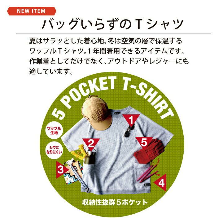 他の画像を見る 収納力抜群の5ポケット付き。着心地の良いワッフル素材。 5ポケット ワッフル Tシャツ コーコス G-437 男女兼用 メンズ レディース 消臭 ポケットが多い 綿100% キャンプ アウトドア 作業服 作業着 制服 ユニフォーム 本体価格 ¥ 2,200 税込 カートに入れる お気に入りに登録する
