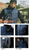 中綿入り防寒ベスト。ハーネス対応の取り出し口やランヤード掛けテープを装備