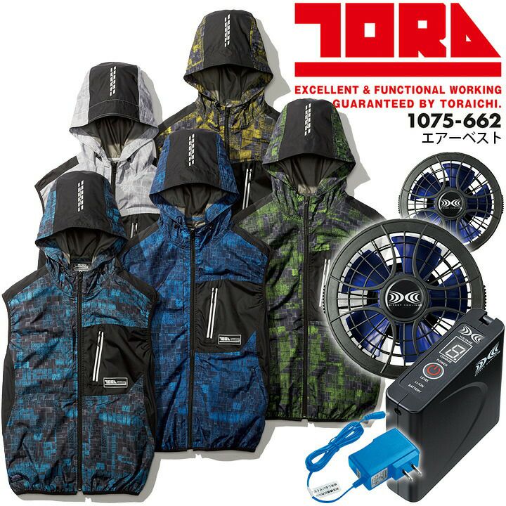 寅壱 空調服 セット エアーベスト ファン&バッテリーセット 1075-662+SKSP01J 春夏 遮熱 軽量 UVカット 防透 遮光 アウトドア スポーツ 空調作業服 作業着 涼しい 熱中症対策グッズ かっこいい おしゃれ サイバー【M-5L】