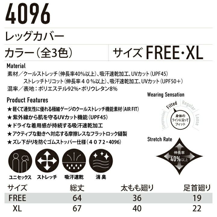 他の画像を見る 汗ばむワークシーンに欠かせない、軽さ(エアーフィット)とドライな着用感が快適に持続するクールコンプレッションニットウェア。 2024 新商品 バートル 夏用 レッグカバー 4096 コンプレッション 吸汗速乾 UVカット ストレッチ ズレにくい スポーツ ジョギング 作業着 作業服 春夏 BURTLE かっこいい メンズ レディース【メール便送料無料】 本体価格 ¥ 979 税込 在庫切れ カートに入れる お気に入りに登録する