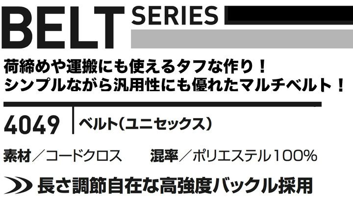 他の画像を見る 長さ調節自在な高強度バックル採用 バートル ベルト 4049 男女兼用 BURTLE 作業用 作業服 作業着 メンズ レディース 本体価格 ¥ 1,914 税込 カートに入れる お気に入りに登録する