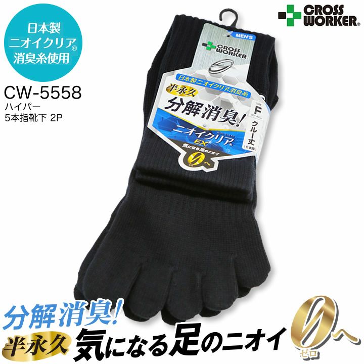 ハイパー 5本指付き 消臭 靴下 2P CW-5558 クルー丈 無地 黒 ニオイクリア ズレ防止 作業用 作業服 作業着 ブラック 足 くさい お悩み