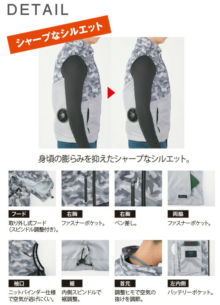 他の画像を見る 身頃の膨らみを抑えたシャープなシルエット。取り外し式フード付き。 ジーベック 空調ファン付きウェア ベスト 服のみ XE98016 春夏 迷彩 カモフラ 作業服 作業着 熱中症対策 XEBEC 【SS-3L】 本体価格 ¥ 5,500 税込 在庫切れ カートに入れる お気に入りに登録する