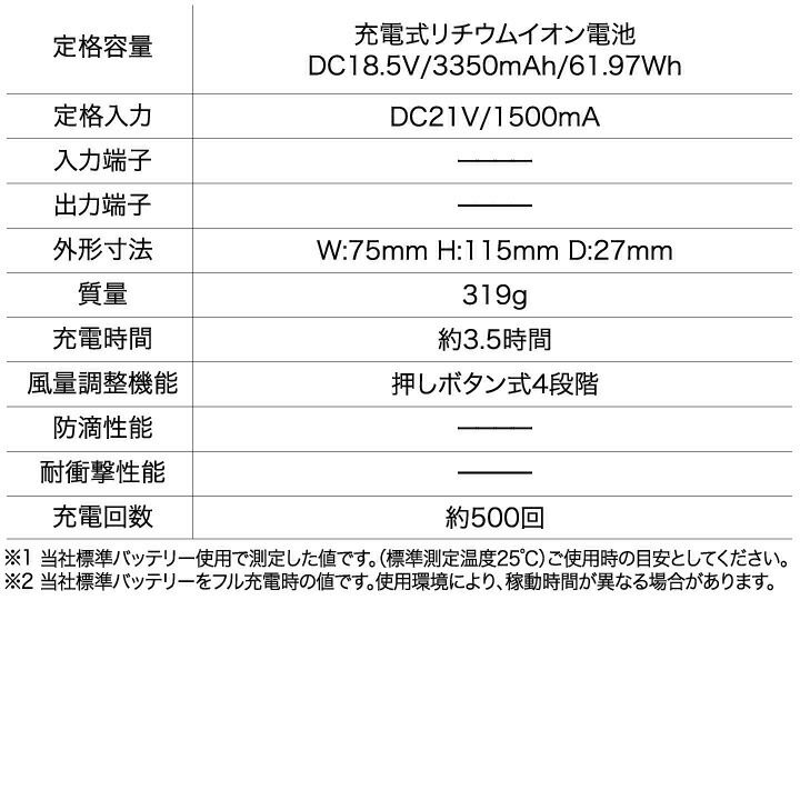 他の画像を見る より強く!より長く!より使いやすく! 最高24V・100リットルにグレードアップして新登場 日本製バッテリーで安全・安心に使用可能 2024 新商品 24V サンエス 空調風神服 リチウムイオンバッテリーセット RD9490PJ 2024年モデル 熱中症対策 涼しい 作業服 作業着 空調ファン付きウェア デバイス 本体価格 ¥ 17,490 税込 在庫切れ 詳細を見る お気に入りに登録する