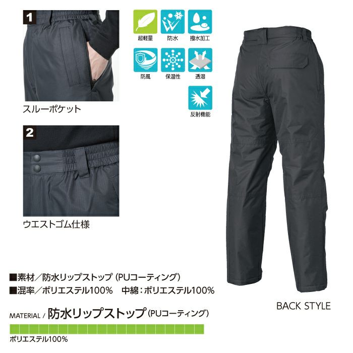 他の画像を見る 水をよせつけいな強力な撥水性能と摩擦にも強い素材を使用・反射素材 クロダルマ 軽量防水防寒パンツ 57198 ズボン 防寒着 防寒服 秋冬 作業着 作業服 本体価格 ¥ 4,730 税込 カートに入れる お気に入りに登録する