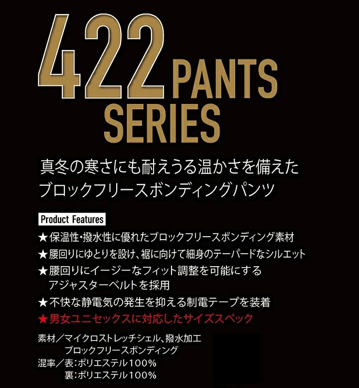 他の画像を見る 真冬の寒さにも耐え得る温かさを備えたブロックフリースボンディングパンツ。 バートル ホットッジョガーパンツ 423 秋冬 保温 撥水 ストレッチ 制電 ブロックフリース 男女兼用 メンズ レディース ズボン 作業服 作業着 BURTLE 本体価格 ¥ 3,250 税込 在庫切れ 詳細を見る お気に入りに登録する