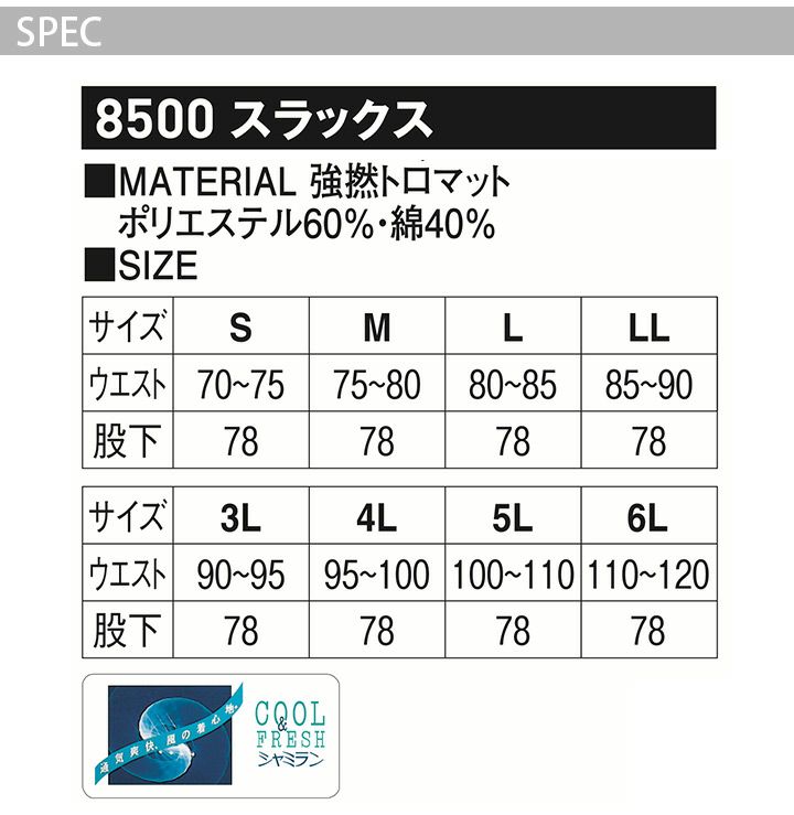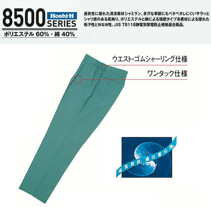 他の画像を見る 通気性に優れた清涼素材シャミラン。多汗な季節にもベタベタしにくいサラッとシャリ感のある肌触り。 スラックス HOSHI 8500 清涼素材 ホシ服装 吸汗 静電気帯電防止 パンツ ズボン 作業服 作業着 ユニフォーム 東レ 本体価格 ¥ 5,935 税込 カートに入れる お気に入りに登録する
