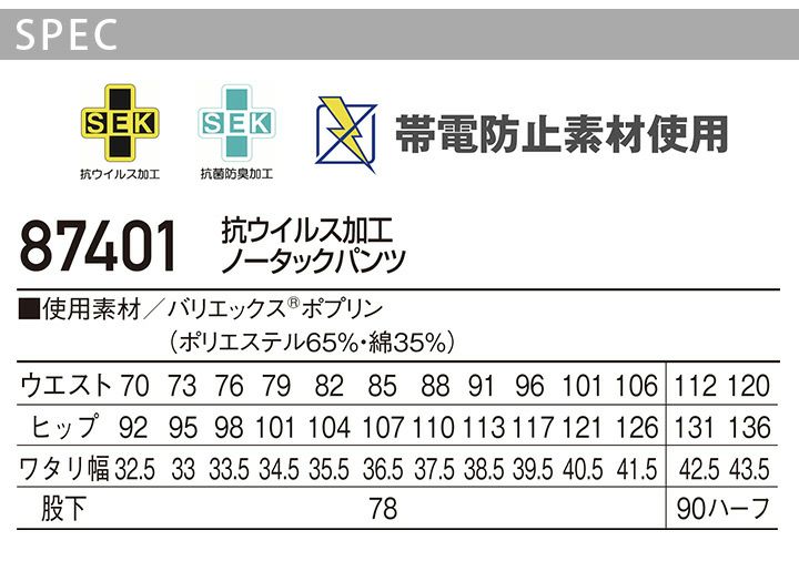 他の画像を見る 抗ウイルス加工素材「バリエックス」を使用した安全・安心の男女ペアユニフォーム。 ノータックパンツ 抗ウイルス加工 自重堂 87401【春夏】男性用 メンズ スラックス ズボン 帯電防止 抗菌防臭 SEK バリエックス 反射 自重堂 作業服 作業着【70-106】 本体価格 ¥ 3,820 税込 カートに入れる お気に入りに登録する