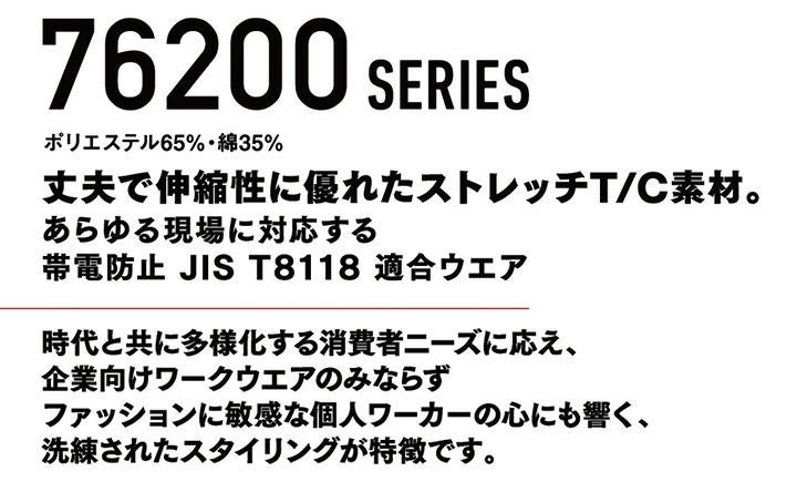 丈夫で伸縮性に優れたストレッチT/C素材。ファッションに敏感な個人ワーカーの心にも響く洗練されたスタイリングが特徴です。