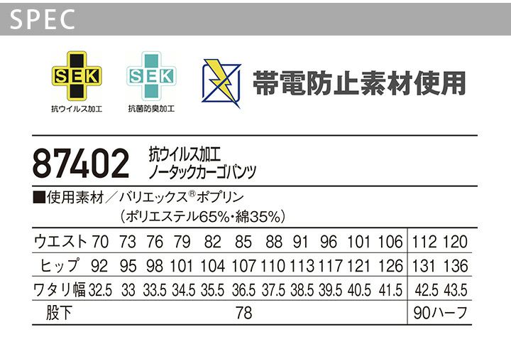 他の画像を見る 抗ウイルス加工素材「バリエックス」を使用した安全・安心の男女ペアユニフォーム。 ノータックカーゴパンツ 抗ウイルス加工 自重堂 87402【春夏】男性用 メンズ ズボン 帯電防止 抗菌防臭 SEK バリエックス 反射 作業服 作業着【70-106】 本体価格 ¥ 3,920 税込 カートに入れる お気に入りに登録する
