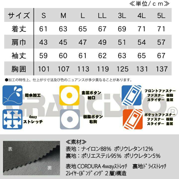 他の画像を見る 動きやすさ抜群!!4wayストレッチで自由自在! GRANCISCO GC-W501 作業着 グランシスコ 長袖ブルゾン ジャンパー 春 秋 冬 撥水 かっこいい 軽量 4way ストレッチ 作業服 耐摩耗 タカヤ商事 GCA700 男女兼用 ユニセックス 大きいサイズ 本体価格 ¥ 6,250 税込 在庫切れ カートに入れる お気に入りに登録する
