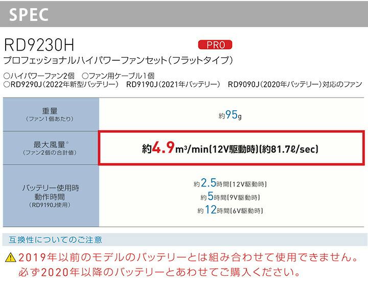 他の画像を見る 2022年モデル!今までにない、プロ仕様!史上最大風量ファン誕生!フラットファン&バッテリーセット。 サンエス 空調風神服 プロハイパワーファン&バッテリーセット 2022年モデル RD9230H RD9290J フラットファン 熱中症対策 涼しい 空調作業服 作業着 電動ファン付きウェア 本体価格 ¥ 18,458 税込 在庫切れ 詳細を見る お気に入りに登録する