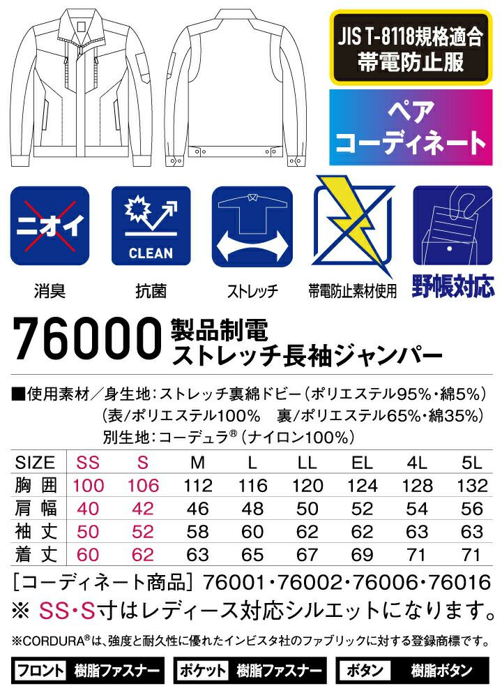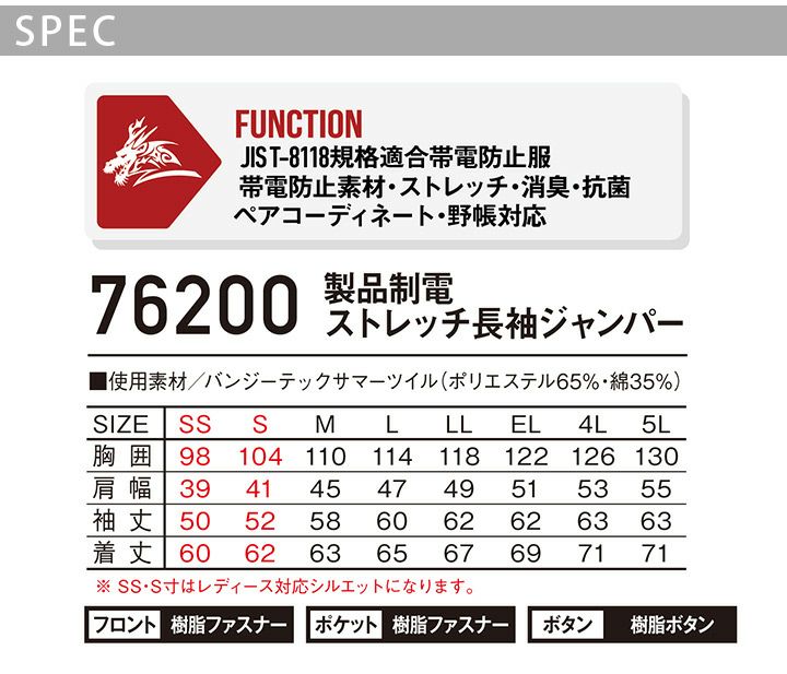 他の画像を見る 丈夫で伸縮性に優れたストレッチT/C素材。ファッションに敏感な個人ワーカーの心にも響く洗練されたスタイリングが特徴です。 長袖ジャンパー 製品制電 ストレッチ Z-DRAGON 76200【春夏】男女兼用 メンズ レディース ブルゾン ジャケット 帯電防止 反射 ストレッチ 消臭 抗菌 自重堂 電気工事 作業服 作業着【SS-EL】 本体価格 ¥ 4,400 税込 カートに入れる お気に入りに登録する