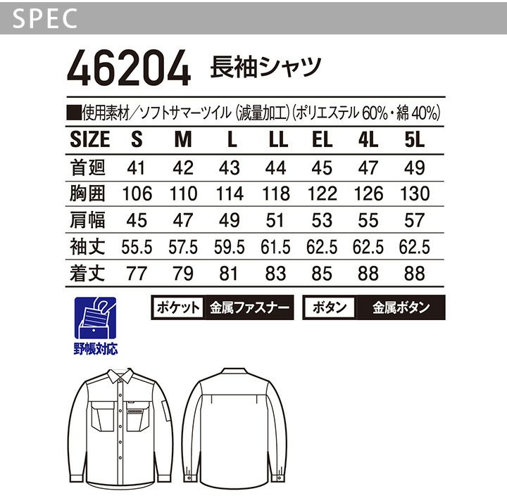 他の画像を見る タフさを追求した、ハードワーカーの新定番。 長袖シャツ 自重堂 46204 メンズ オールシーズン 男性用 年間 通年 帯電防止 作業服 作業着【S-LL】 本体価格 ¥ 2,990 税込 カートに入れる お気に入りに登録する