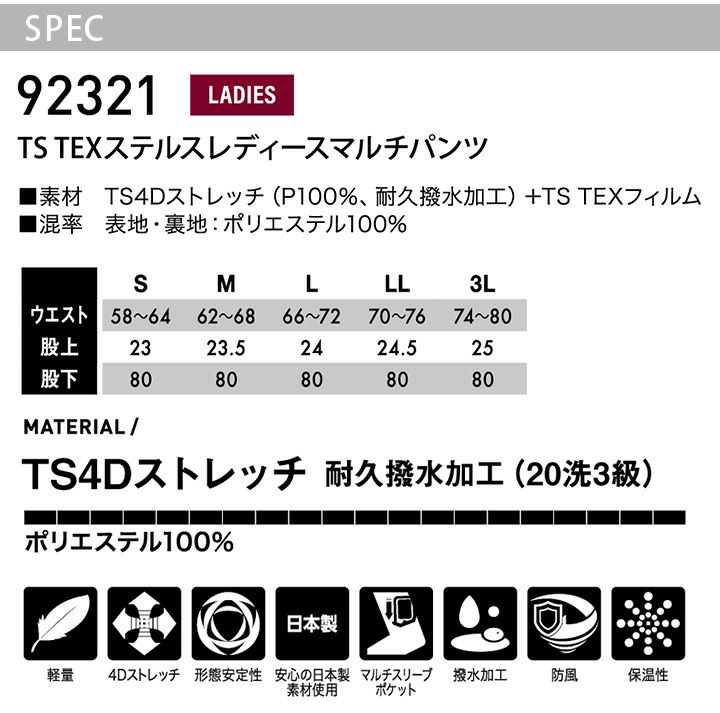 他の画像を見る ストレッチ性と防風性を融合したステルス冬版。 TS-DESIGN ステルスレディースマルチパンツ 92321 TS TEX 秋冬 女性用 スーツ スラックス ワークウェア フォーマル 作業服 作業着 撥水 ストレッチ 藤和 本体価格 ¥ 7,190 税込 在庫切れ カートに入れる お気に入りに登録する