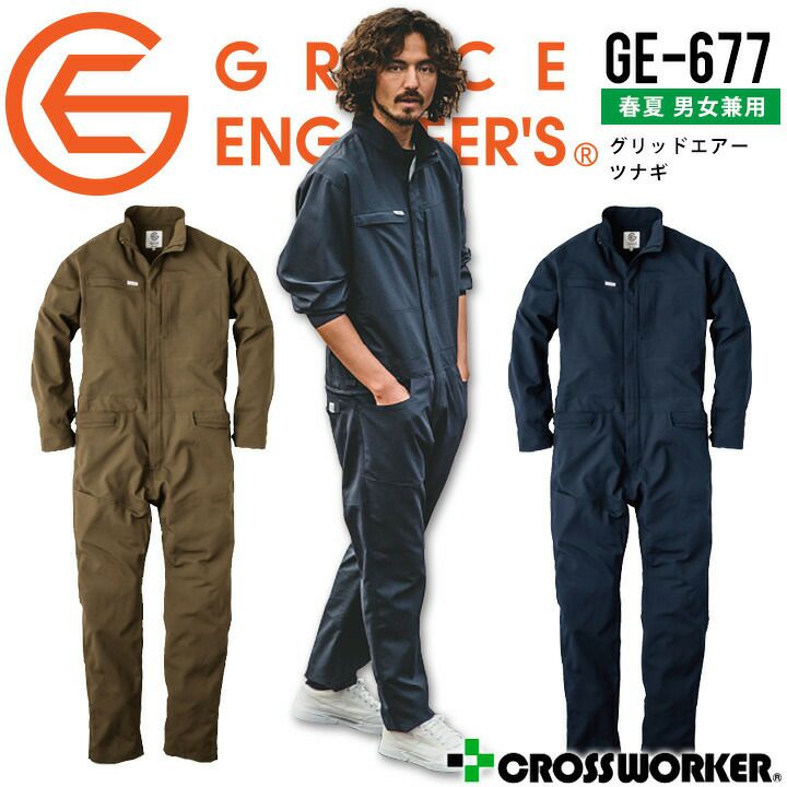 長袖つなぎ 春夏 男女兼用 GE-677 グレースエンジニアーズ 涼しい グリッドエアーツナギ エスケープロダクト 作業服 作業着 軽量 シンプル 動きやすい ヒップオープン 腰ファスナートイレが楽 かわいい おしゃれ 自動車整備士 農作業 畑仕事 金具が表に出ない
