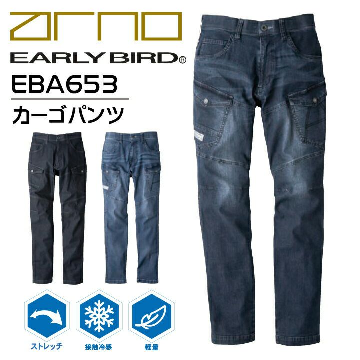 デニム カーゴパンツ 接触冷感 春夏 EBA653 ストレッチ メンズ 軽量 パンツ ズボン ジーンズ ジーパン 作業服 作業着 かっこいい EARLY BIRD arno EBA653UD EBA653BR アウトドア カジュアル