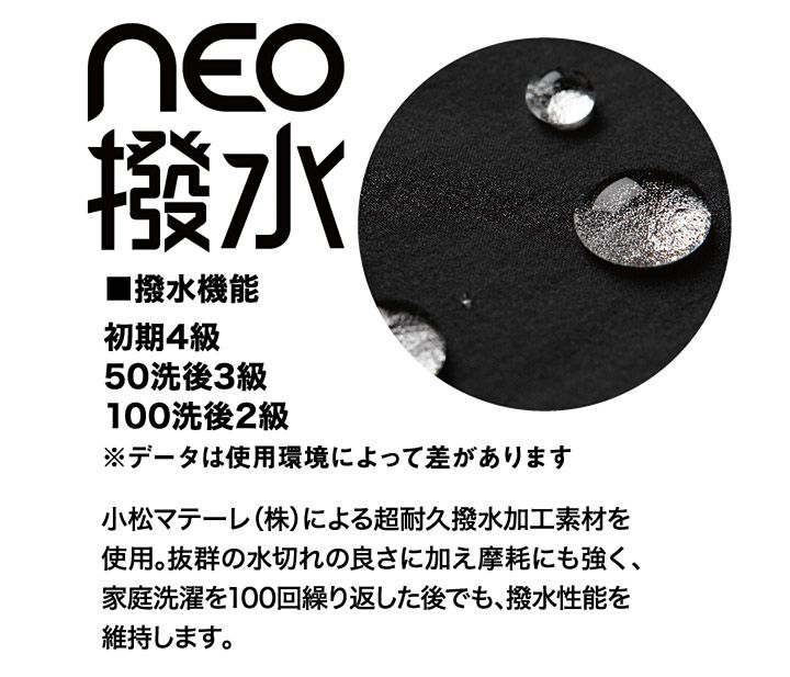 抜群の水切れの良さに加え磨耗にも強い。超耐久撥水加工素材使用。