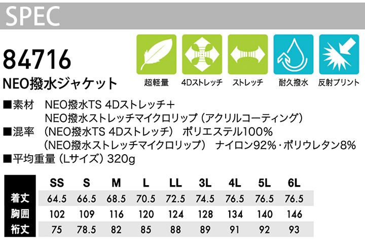 TS-DESIGN NEO撥水ジャケット 84716 年間 オールシーズン 反射 ストレッチ 耐久 撥水 ブルゾン ジャンパー 作業着 作業服 藤和 TSデザイン【SS-LL】