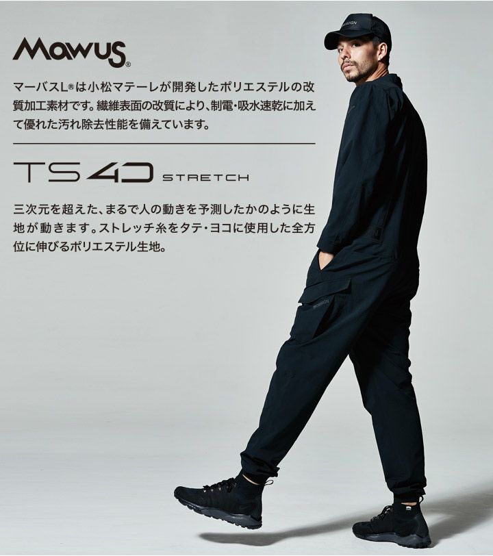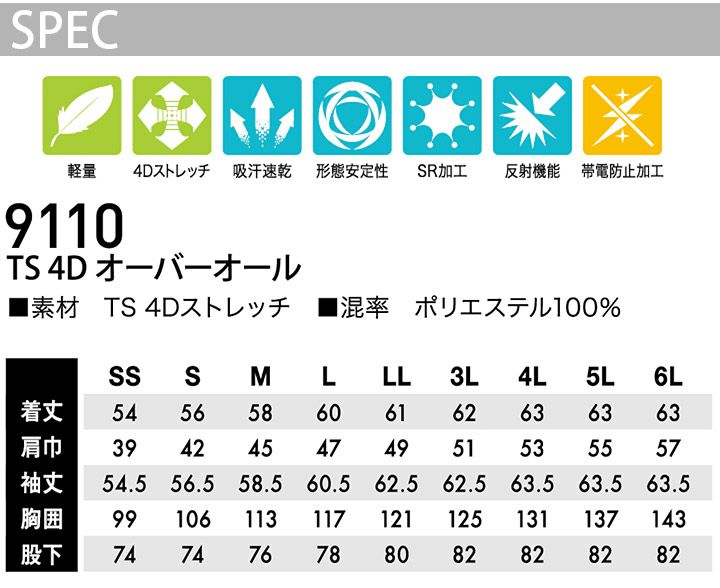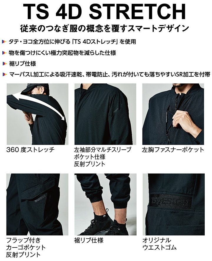 TS-DESIGN TS 4D オーバーオール 9110 男女兼用 ストレッチ 吸汗速乾 形態安定 反射 帯電防止 軽量 つなぎ 作業着 作業服 藤和【SS-LL】