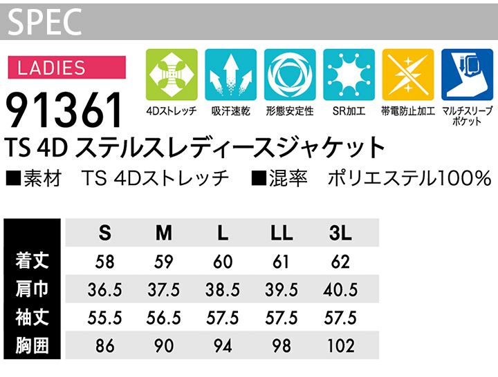 TS-DESIGN TS 4D ステルスレディースジャケット 91361 女性用 ストレッチ 吸汗速乾 帯電防止 ブルゾン 作業着 作業服 藤和【S-LL】