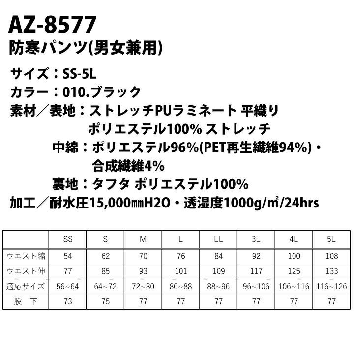 パンツのみ 冷凍庫用 防寒着 防水防寒 防寒服 防寒パンツ アイトス 8577 ユニセックス メンズ レディース 男女兼用 ブラック 極寒対策 -60℃ Aitoz 小さいサイズ 大きいサイズ 【SS-5L】