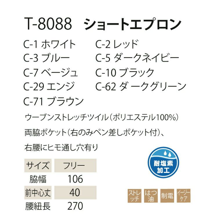 他の画像を見る 漂白剤・汚れ・静電気に強いイージーケアのショートエプロン40cm丈。 ショートエプロン 40丈 T-8088 T8088 チトセ arbe アルべ メンズ レディース 男女兼用 ストレッチ はっ水 汚れにくい 制電加工 飲食店 カフェ レストラン サービス キッチン 厨房 スタッフ サービス業 ユニフォーム 制服 作業着 作業服_メール便送料無料※代引不可 本体価格 ¥ 2,508 税込 カートに入れる お気に入りに登録する