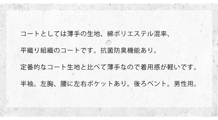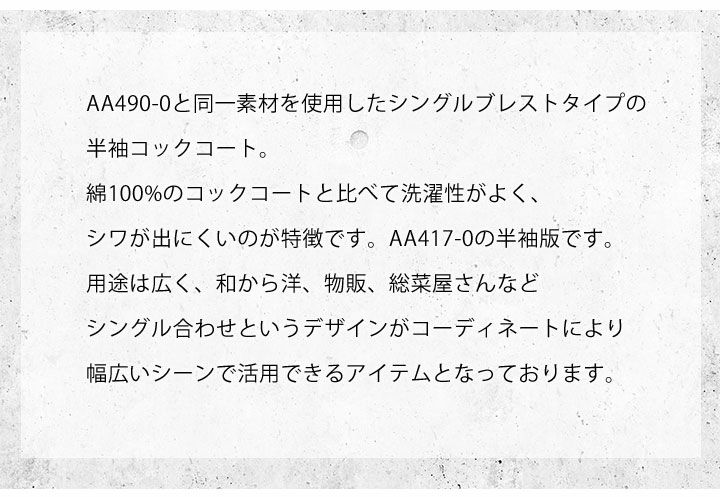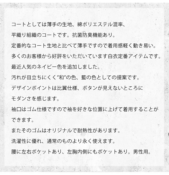 他の画像を見る 定番調理用コート。抗菌防臭加工生地使用。 セブンユニフォーム AA322 コート 半袖 男性用 メンズ 抗菌防臭 レストラン 調理用 厨房 白衣 飲食店 本体価格 ¥ 3,520 税込 カートに入れる お気に入りに登録する
