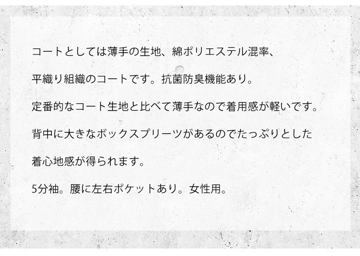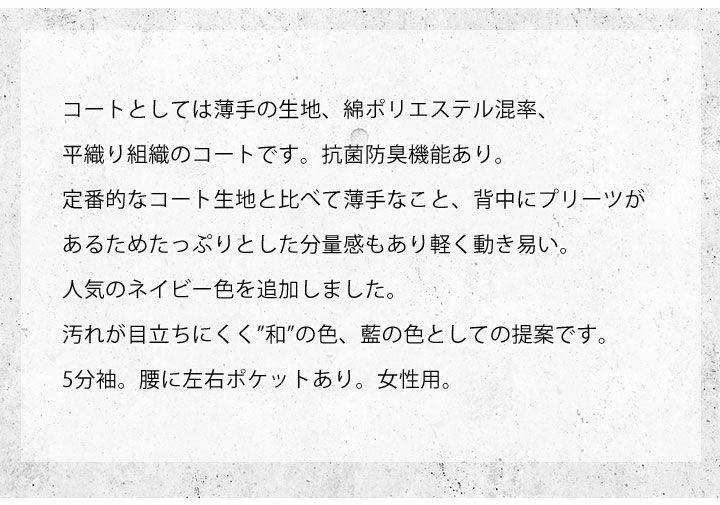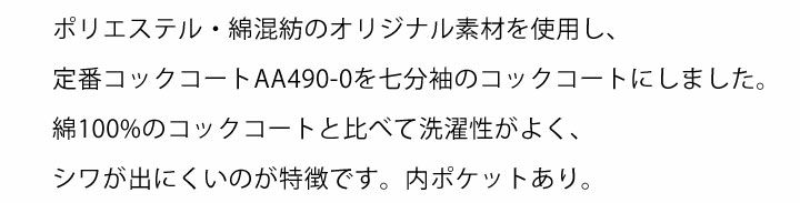 他の画像を見る 定番調理用コート。抗菌防臭加工生地使用。 セブンユニフォーム AA331 コート 七分袖 女性用 レディース 抗菌防臭 レストラン 調理用 厨房 白衣 飲食店 本体価格 ¥ 3,575 税込 カートに入れる お気に入りに登録する